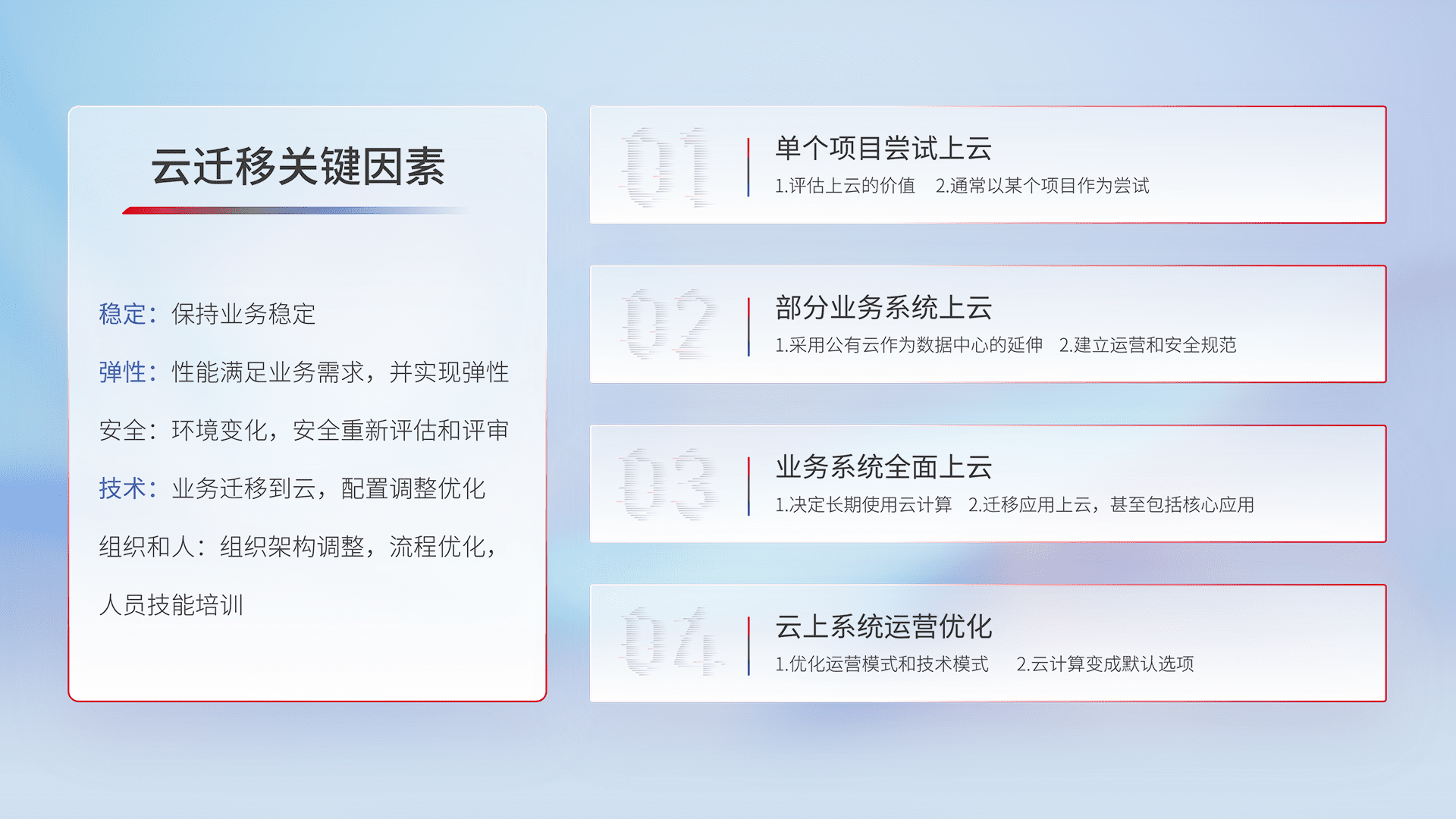 结合实际业务,,从规划设计、、、云平台选型、、、云原生改造、、、、数据迁移、、、、集成交付,,迁移全过程为客户识别最佳上云路径,,,,做好风险识别管理,,设计网络架构、、、、身份权限、、、、安全审计合规、、、操作审计、、日志审计、、监控告警策略、、多站点容灾设计等,,,,对云上基础设施进行整体规划,,,,提升IT治理水平,,,,以满足弹性、、、高可用、、高性能的需求。。。。