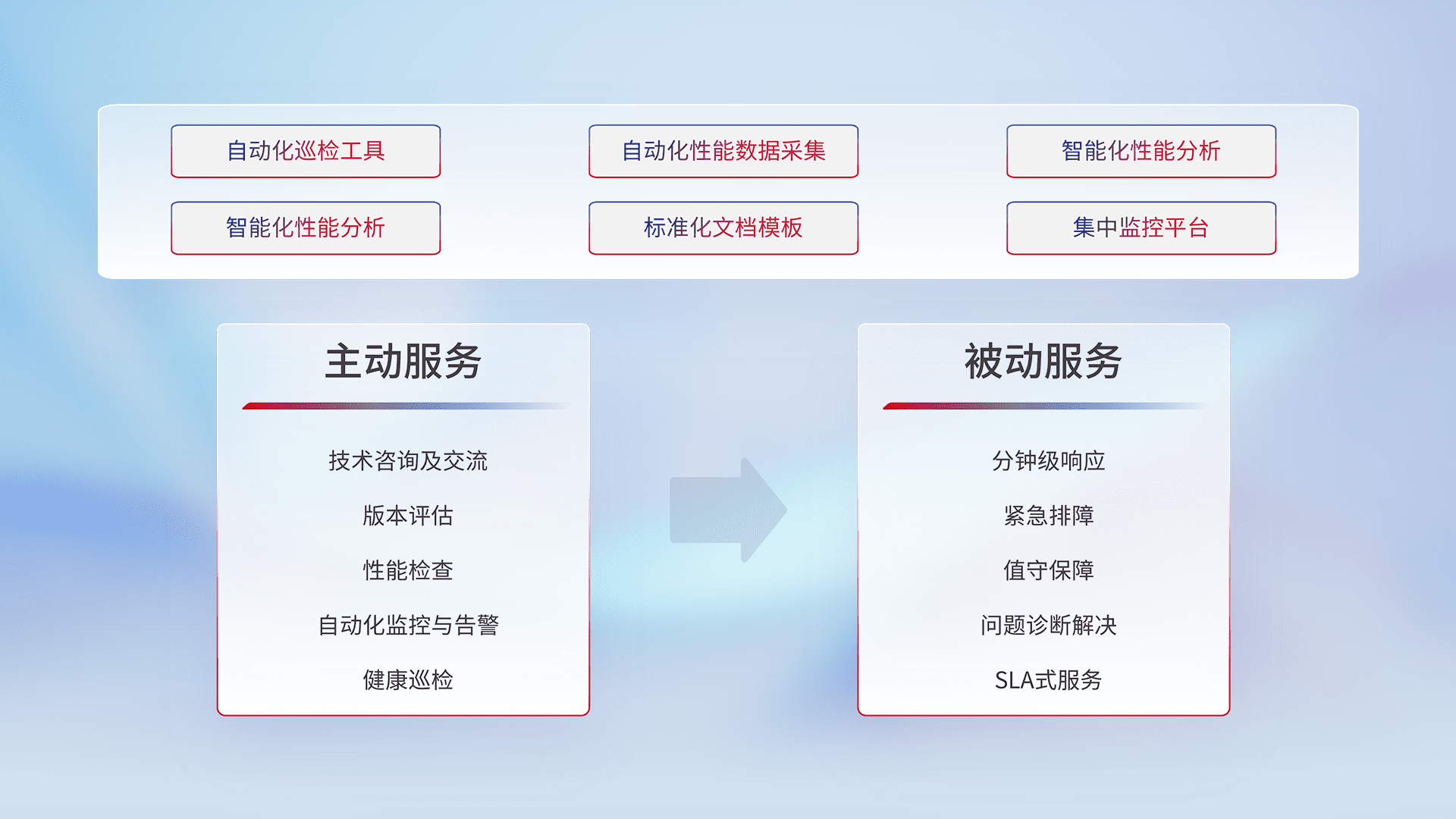 智能化工具和标准化文档,,,,保障服务质量,,提供主动服务(包含技术咨询、、版本评估、、性能检查、、、、自动化监控与告警、、健康巡检)和被动服务包含(分钟级响应、、、紧急排障、、、值守保障、、、问题诊断解决、、、SLA服务)。。。
