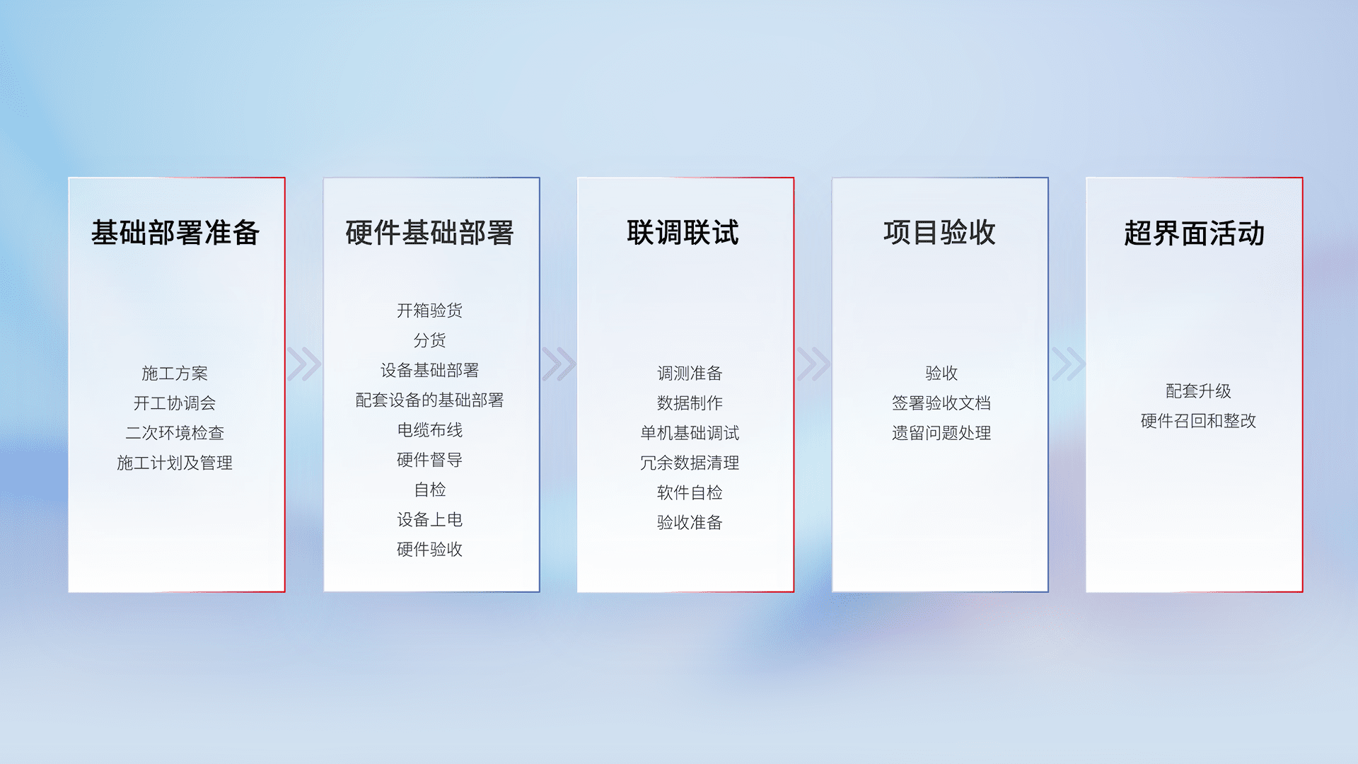 从基础部署准备、、硬件基础部署、、联调联试、、、、项目验收、、越界面活动的全过程可追溯,,保证施工质量和进度。。。。